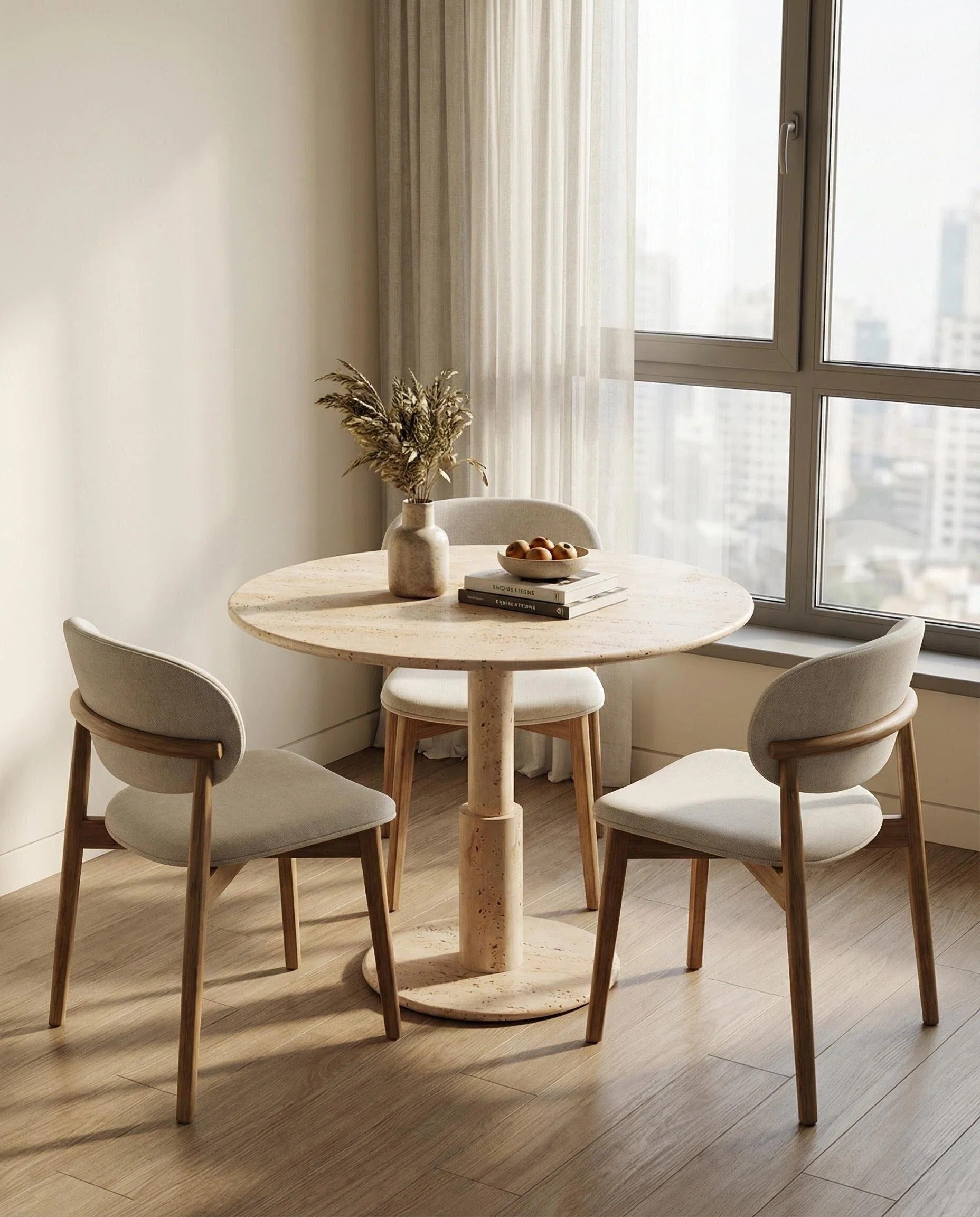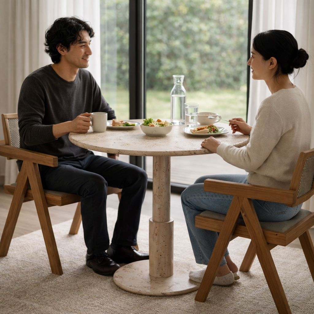 Mesa auxiliar de mármol travertino CloudDream: luces nocturnas y carga inalámbrica