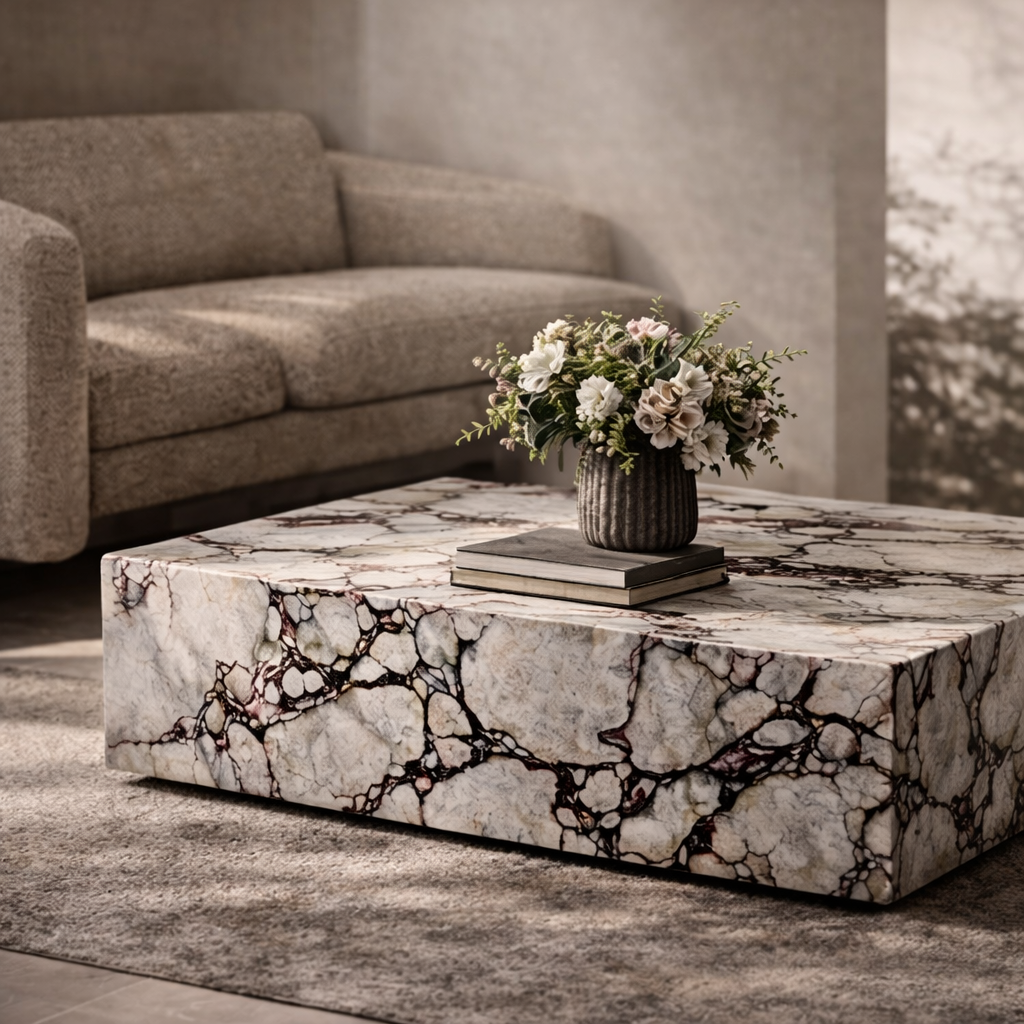 Its clean rectangular plinth silhouette brings bold geometry, architectural weight, and quiet sophistication to the living room. The dramatic burgundy and purple veining against a pale stone background gives the ViolaPlinth a rich natural presence that feels both artistic and timeless. Whether placed in a refined lounge, a modern apartment, or a thoughtfully styled seating area, it creates a striking focal point with sculptural depth.